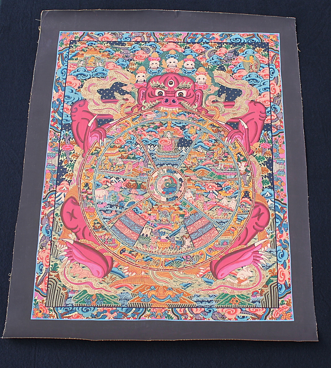 The Wheel of Life is a detailed depiction of the fundamental Tibetan belief of transmigratory existence. It explains the theory of rebirth in the clearest way: How a person is reborn in the universe depends on the person’s desires, actions, and the amount of merit and demerits (karma). How well he has done in his previous life. The suffering of rebirth affects the entire living universe. The wheel is held in the embrace of Yama or Shenje. He is the ruler of the dead, who shows that all living beings eventually meet death. Outside the wheel is the figure of…